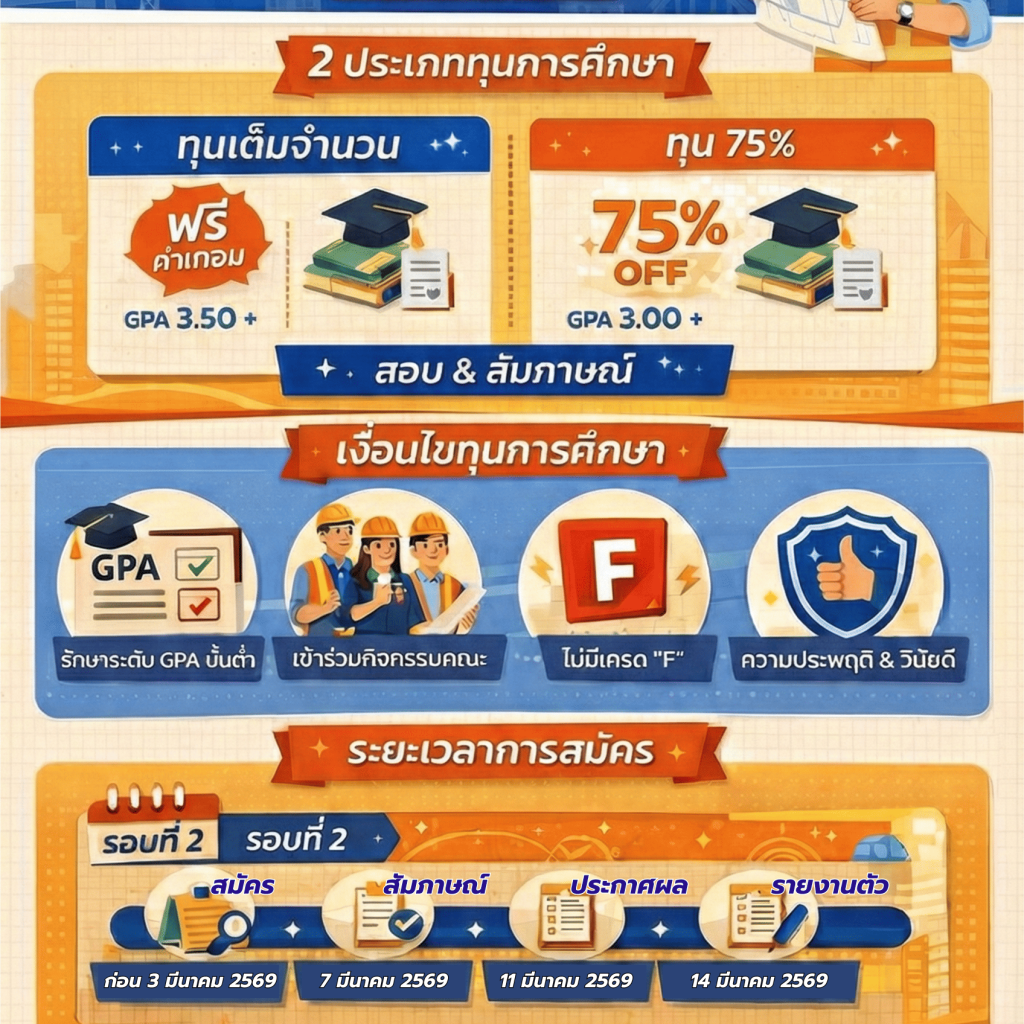 📢 เด็กวิศวะฯ ห้ามพลาด! แจกทุนเรียนดี “เพชรวิศวเกษม รุ่นที่ 7” ม.เกษมบัณฑิต ปี 69 🛠️🎓น้องๆ ม.6 หรือ ปวช. ที่มีความฝันอยากเป็นวิศวกร โอกาสดีมาถึงแล้ว! คณะวิศวกรรมศาสตร์ มหาวิทยาลัยเกษมบัณฑิต เปิดรับสมัครนักศึกษาใหม่พร้อมทุนการศึกษาตลอดหลักสูตร!📌 ประเภททุนการศึกษา1️⃣ […]